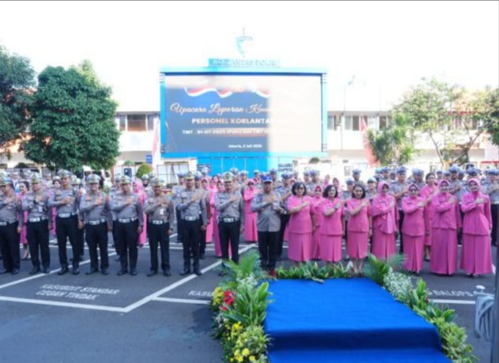 Jakarta,SaberPungli.net: Kepala Korps Lalu Lintas (Korlantas) Polri Irjen Pol Drs. Agus Suryonugroho, S.H., M.Hum., memimpin Upacara Laporan Kenaikan Pangkat Personel Korlantas Polri di Lapangan NTMC, pada Rabu (2/7/2025).