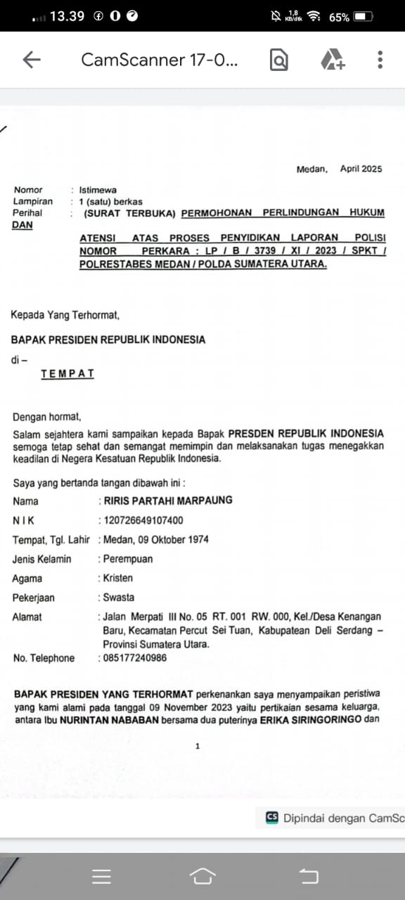 Sumatra Utara,SaberPungli.net:Dua warga Medan, Doris Fenita br Marpaung dan Riris Partahi br Marpaung melayangkan surat terbuka kepada Presiden Republik Indonesia ,kamis 17 April 2025 .