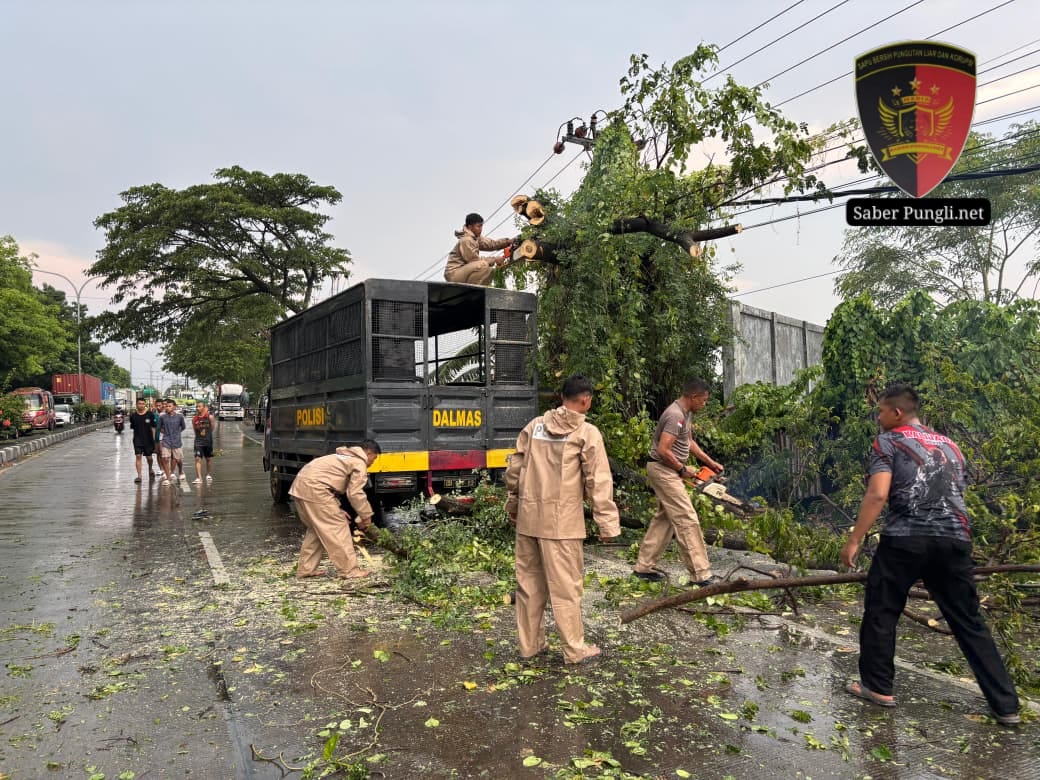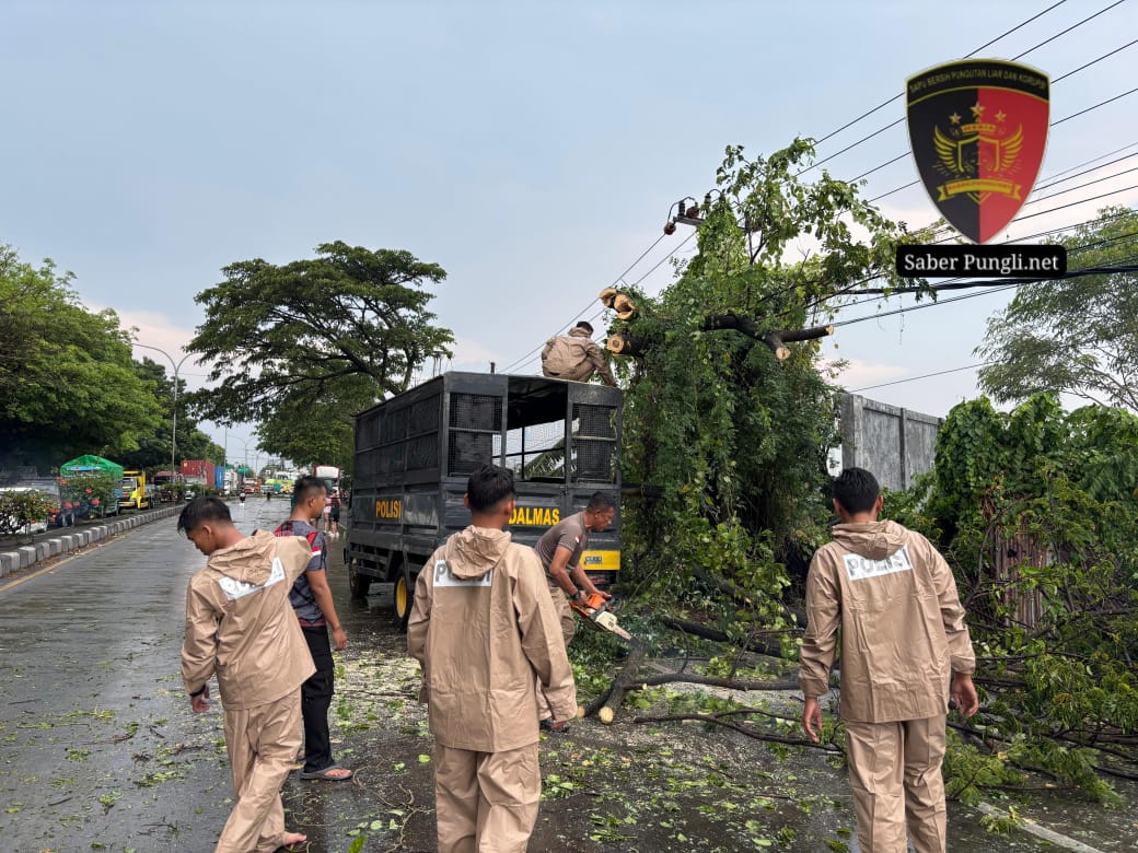Mengetahui adanya kejadian tersebut, Satuan Samapta Polres Demak sigap bergerak cepat ke lokasi untuk melakukan evakuasi. Dengan menggunakan gergaji mesin dan peralatan manual, petugas berupaya memotong batang pohon yang roboh agar akses jalan segera bisa dilalui kembali oleh masyarakat.