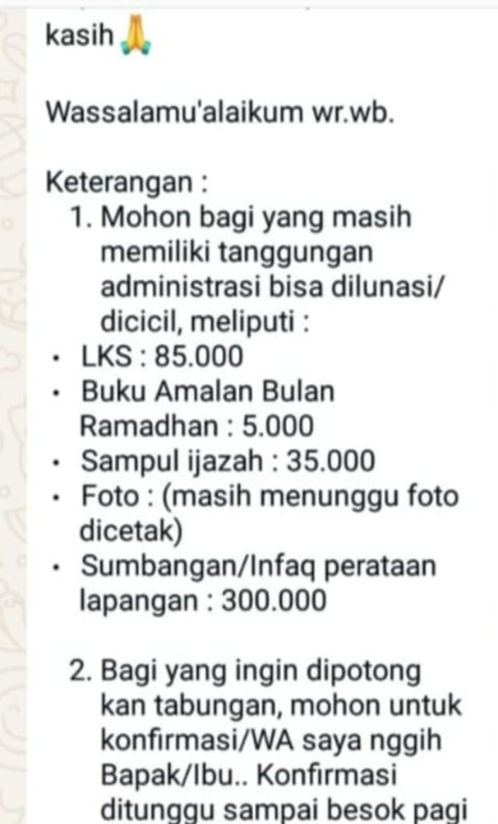 Menurutnya, iuran tersebut selalu naik setiap kenaikan kelas. Pada tahun ini, ia harus merogoh kocek Rp. 300 ribu untuk uang sumbangan/Infaq perataan lapangan. Masak uang sumbangan kok nekan KaYak gini , Ditambah ada uang sampul ijazah Rp.35.000 per siswa kelas 6 SD , belum lagi uang foto yang belum ditentukan jumlahnya karena menunggu foto dicetak. Yang lebih parahnya lagi sampai Guru Berinisial SK mau memotongkan tabungan dari siswa siswi SDN 3 Weding.