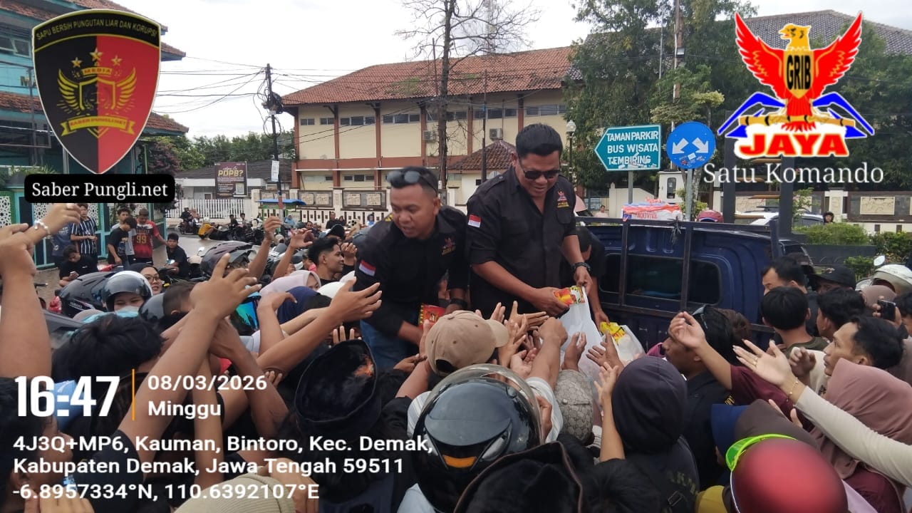 Demak [SaberPungli.net] Semangat berbagi di bulan suci Ramadan ditunjukkan oleh Dewan Pimpinan Cabang (DPC) GRIB Jaya Kabupaten Demak dengan menggelar kegiatan pembagian takjil kepada masyarakat, Minggu (8 Maret 2026).
