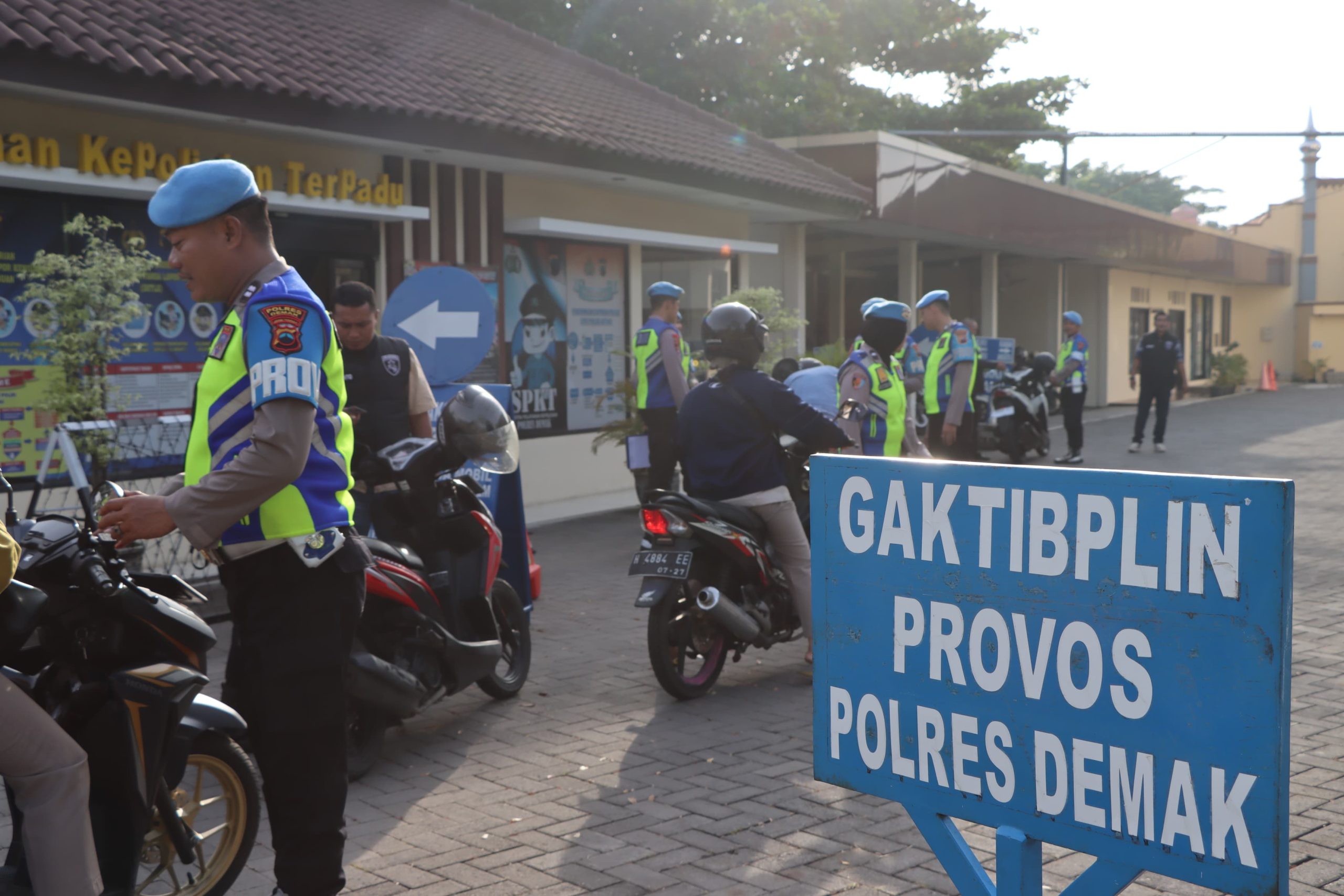 Demak,SaberPungli.net:Seksi Profesi dan Pengamanan (Sipropam) Polres Demak melaksanakan Penegakan Ketertiban dan Pendisiplinan (Gaktibplin) anggota di Pintu masuk Polres Demak, Selasa (11/02/2025).