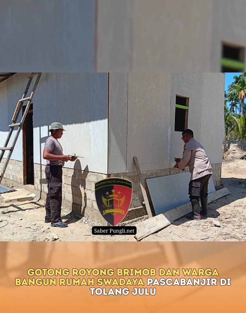 Gotong Royong Brimob dan Warga Bangun Rumah Swadaya Pascabanjir di Tolang Julu