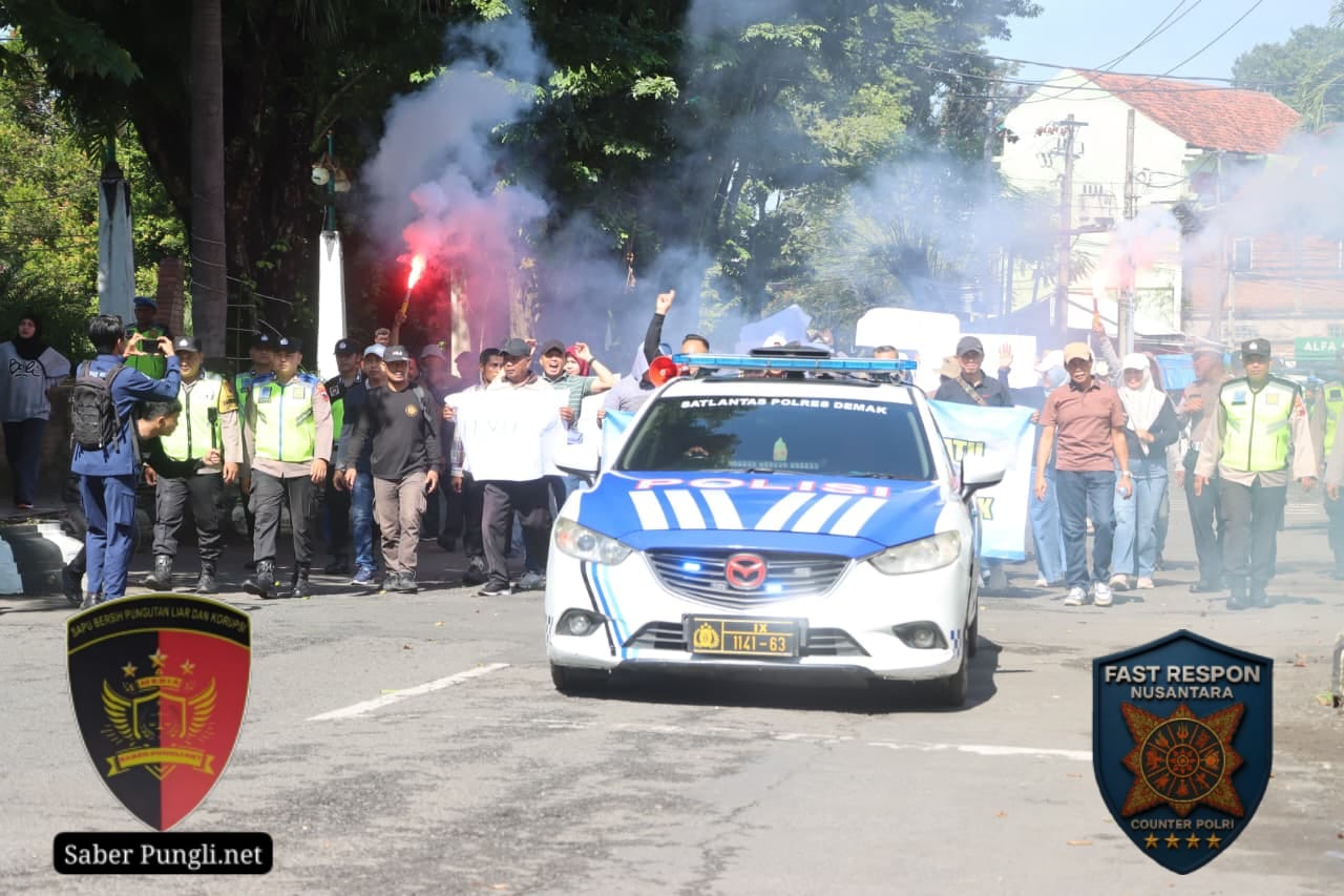 Aksi unjuk rasa berujung ricuh, ditandai dengan dorong-dorongan, pelemparan batu, hingga pembakaran ban di depan Kantor Bupati Demak.