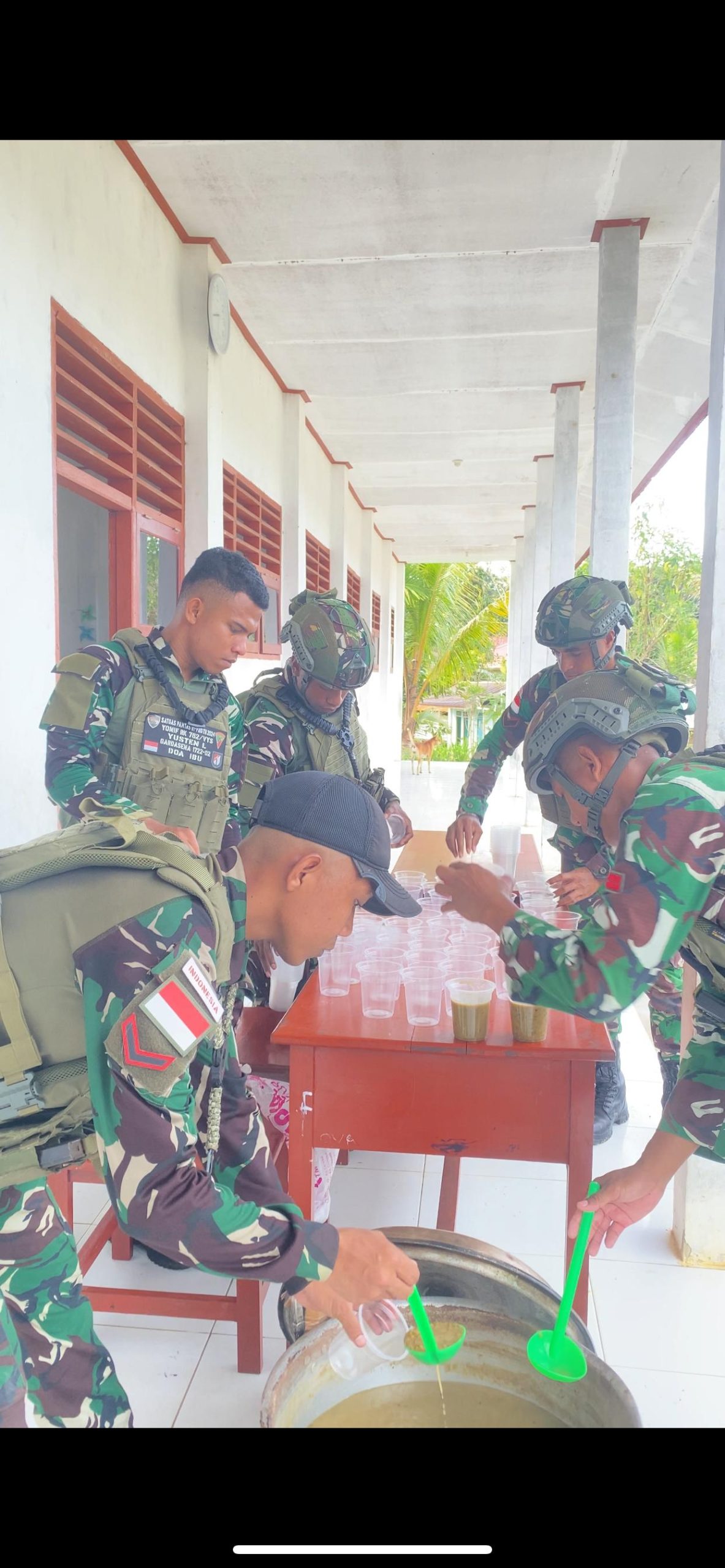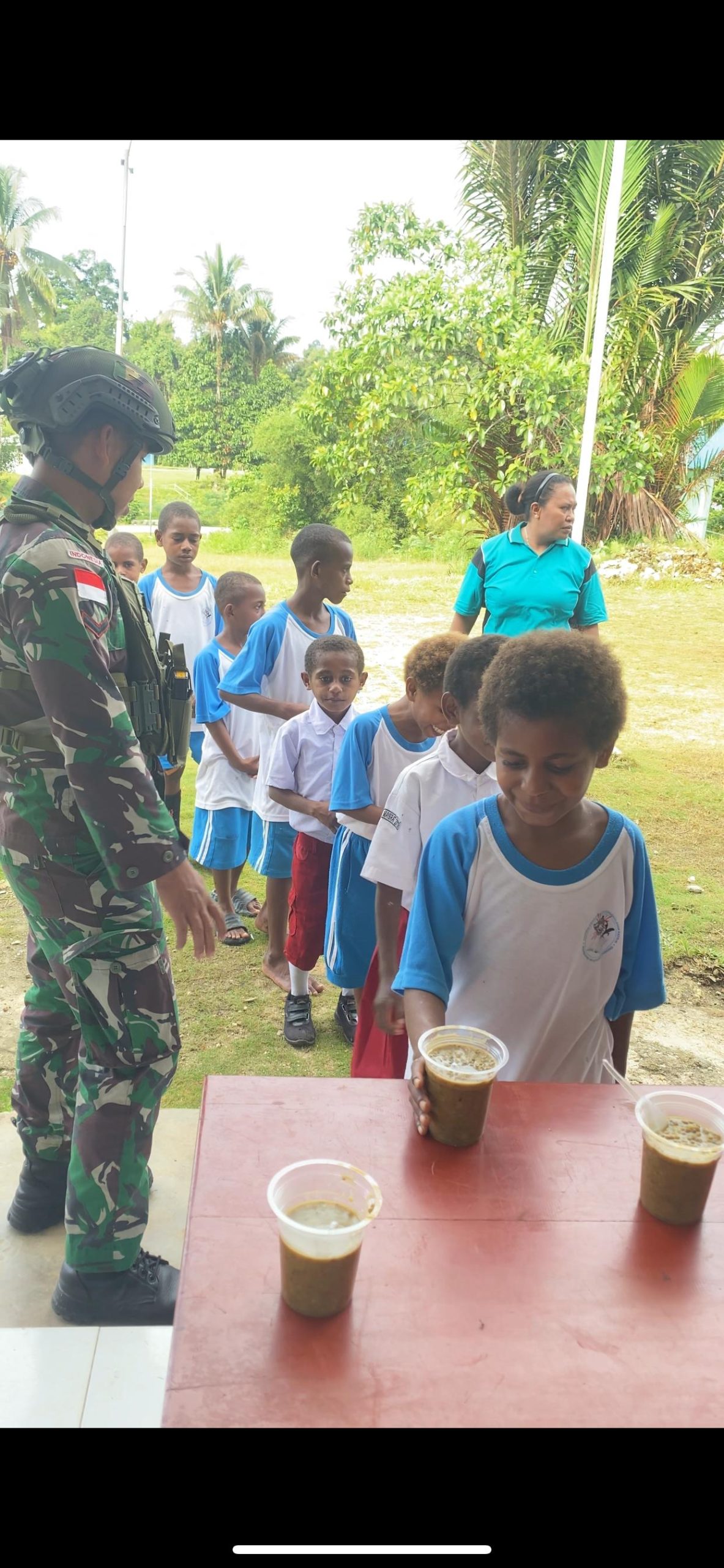 Hadirkan Senyuman, Satgas Yonif 762/VYS Bagikan Bubur Kacang Hijau Kepada Murid SD YPPK Yamko Konja