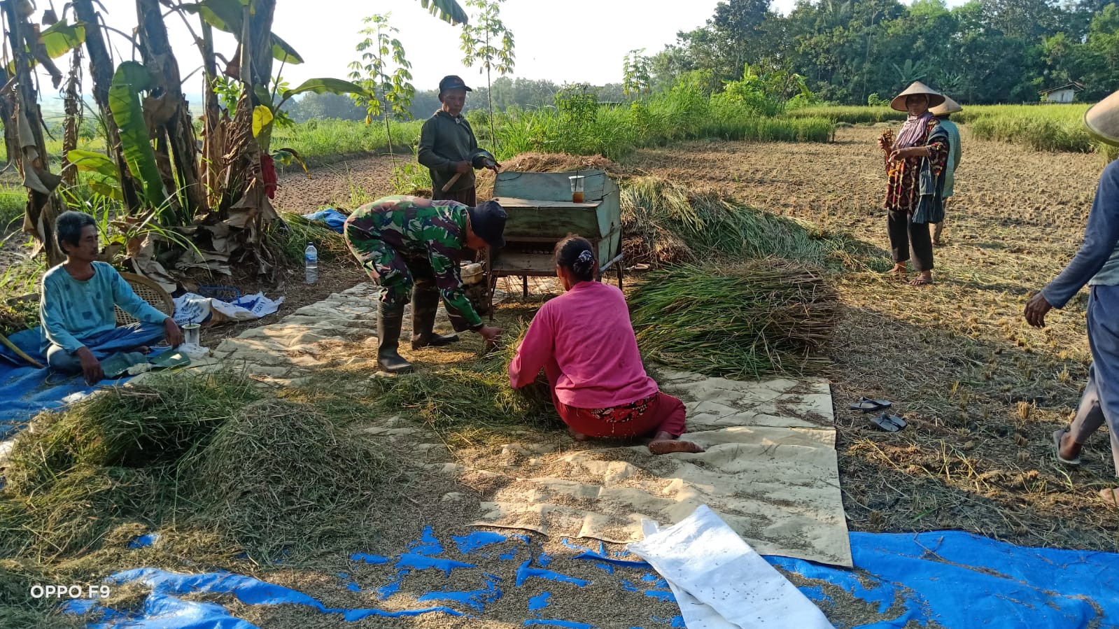 Babinsa Koramil 14/Klego Kodim 0724/Boyolali Sertu Suwito membantu petani melaksanakan pendampingan serta membantu proses perontokan bulir padi.