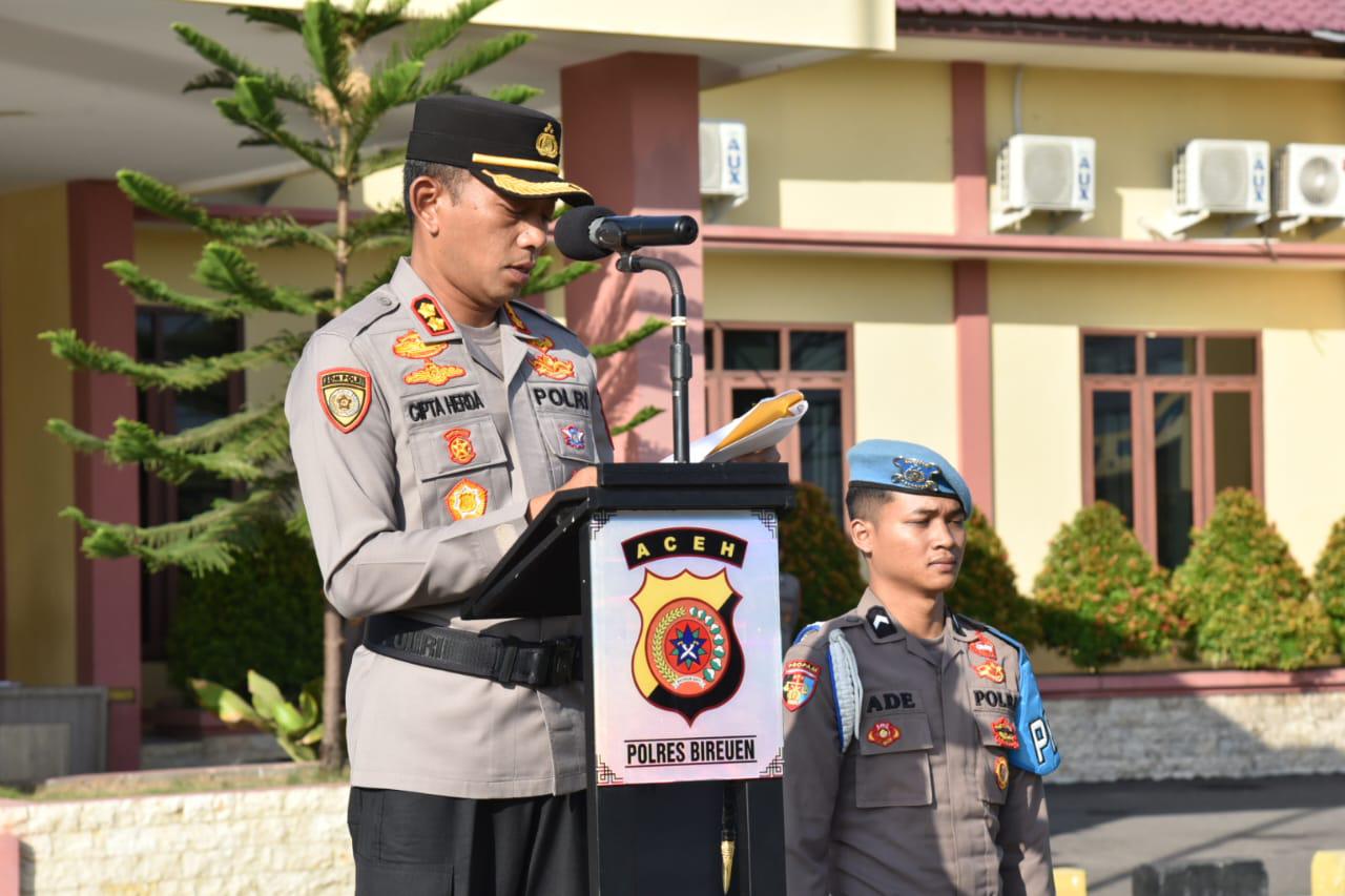 Kapolres Bireuen AKBP Tuschad Cipta Herdani, S.I.K., M.Med., Kom., dalam amanatnya mengatakan terima kasih dan penghargaan yang setinggi – tingginya atas semua prestasi yang saudara raih, dan teruslah menjadi contoh dan inovator di Polres Bireuen