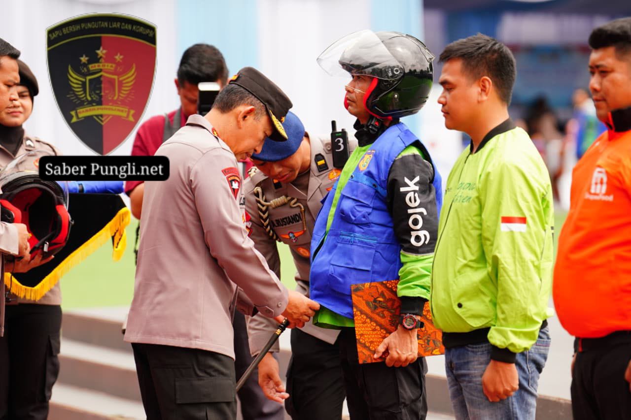 Jabar [SaberPungli.net] Kapolri Jenderal Listyo Sigit Prabowo memimpin apel ojek online (ojol) kamtibmas ‘Sauyunan Jaga Lembur’ Polda Jawa Barat di Lapangan Upakarti, Soreang, Kabupaten Bandung, Jawa Barat (Jabar), Sabtu, 8 November 2025. Kegiatan ini merupakan sinergisitas untuk saling menjaga keamanan di lingkungan masyarakat.