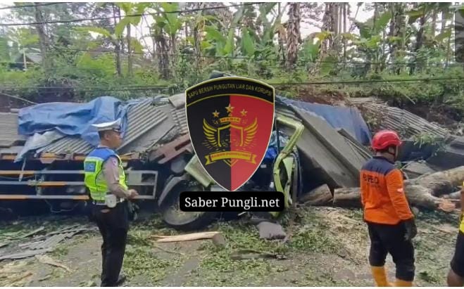 [SaberPungli.net] Sebuah truk trailer bermuatan asbes mendadak oleng sebelum akhirnya menghantam pepohonan dan terperosok ke parit di pertigaan Gamol.