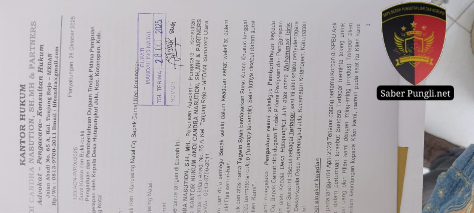 Panyabungan [SaberPungli.net] 28 Oktober 2025 — Kasus dugaan tindak pidana penipuan dan penggelapan yang melibatkan oknum Kepala Desa Hutapungkut Julu, Kecamatan Kotanopan, Kabupaten Mandailing Natal, mencuat ke publik setelah dilaporkan secara resmi oleh Kantor Hukum Andi Candra Nasution, S.H., M.H. & Partners kepada Bupati Mandailing Natal dan Camat Kotanopan.