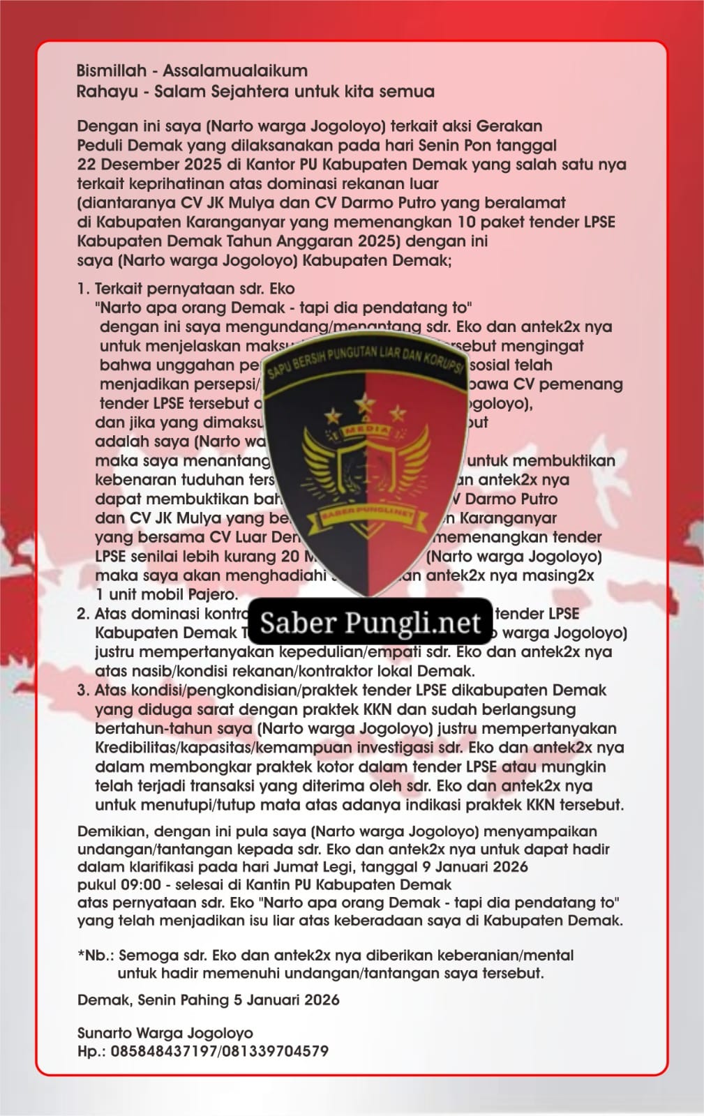 Klarifikasi tersebut penting agar fokus utama audiensi, yakni transparansi dan akuntabilitas LPSE di lingkungan PUPR Kabupaten Demak, tidak teralihkan oleh polemik komunikasi personal.