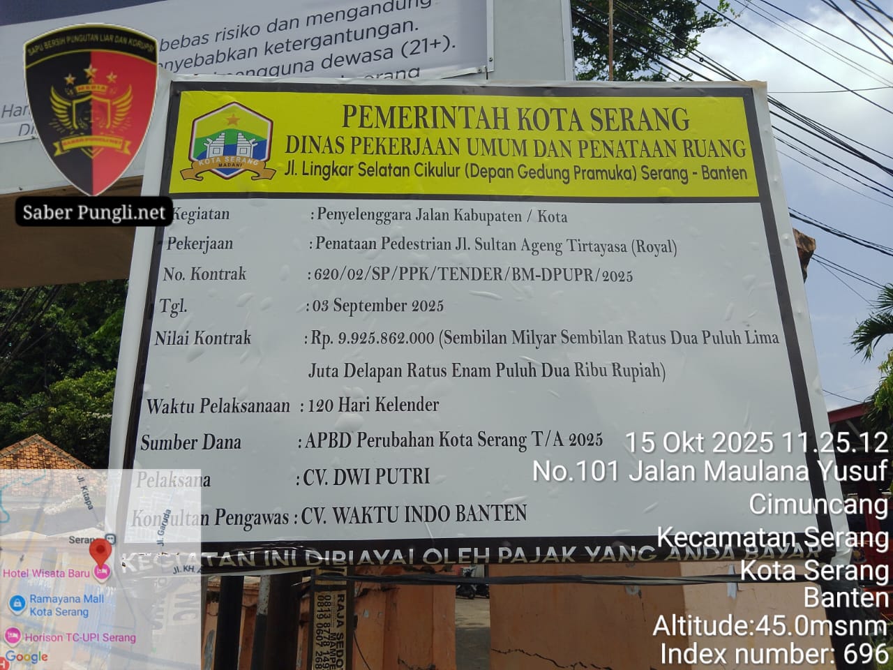 Proyek tersebut diketahui merupakan Pekerjaan Penataan Pedestrian Jalan Sultan Ageng Tirtayasa (Royal) dengan Nomor Kontrak: 620/02/SP/PPK/TENDER/BM-DPUPR/2025, bersumber dari APBD Perubahan Kota Serang Tahun Anggaran 2025, dengan pagu anggaran sebesar Rp9,9 miliar lebih.