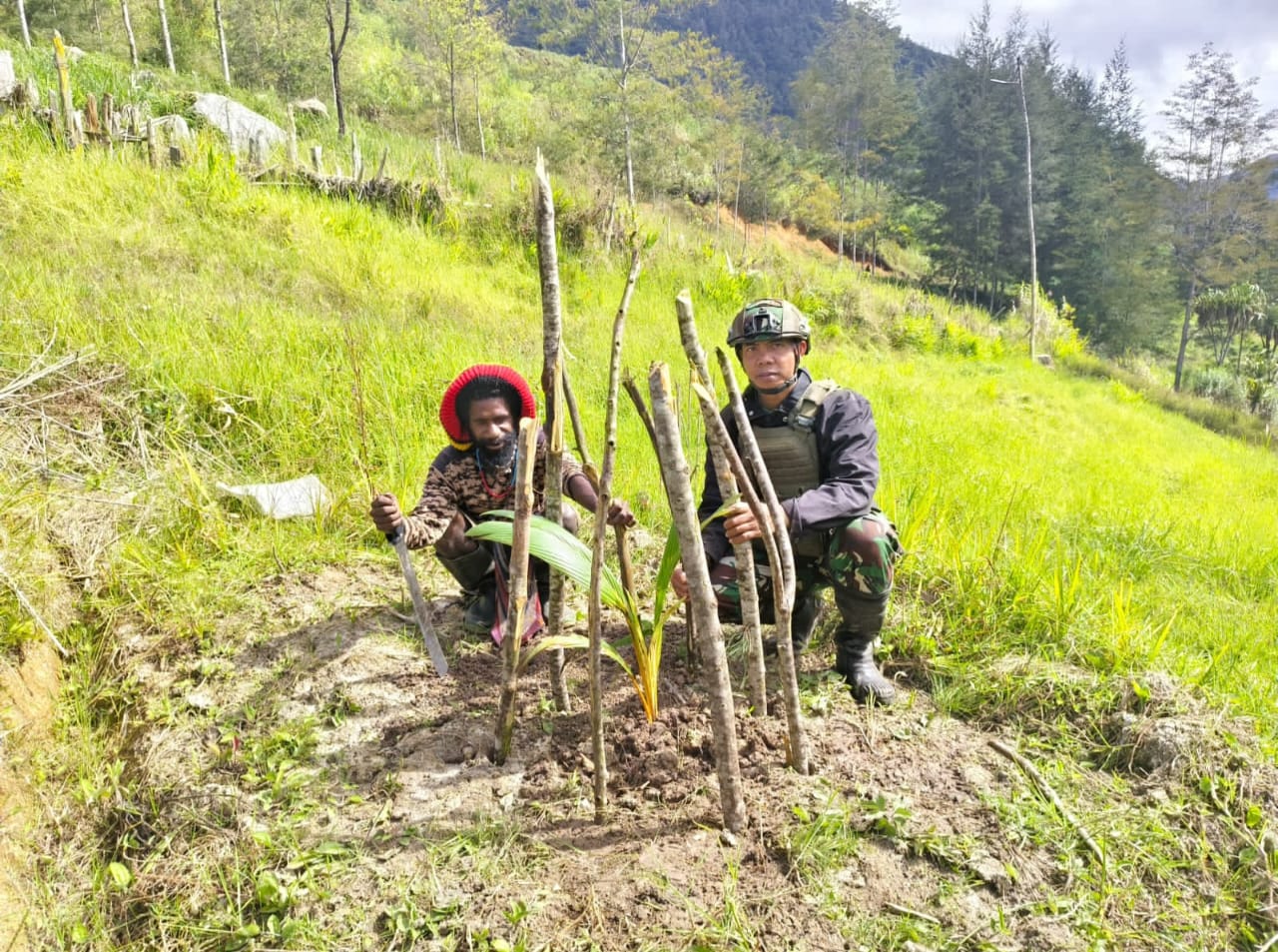 Kegiatan ini dipimpin langsung oleh Danpos Wuloni, Lettu Inf I Made Mertiana, bersama Ketua Adat Kampung Wuloni, Bapak Jatinus Murib. Di bawah sinar pagi yang hangat dan hamparan alam yang menawan, sinergi TNI dan rakyat terwujud dalam wujud nyata: menggenggam tanah, menanam bibit harapan.