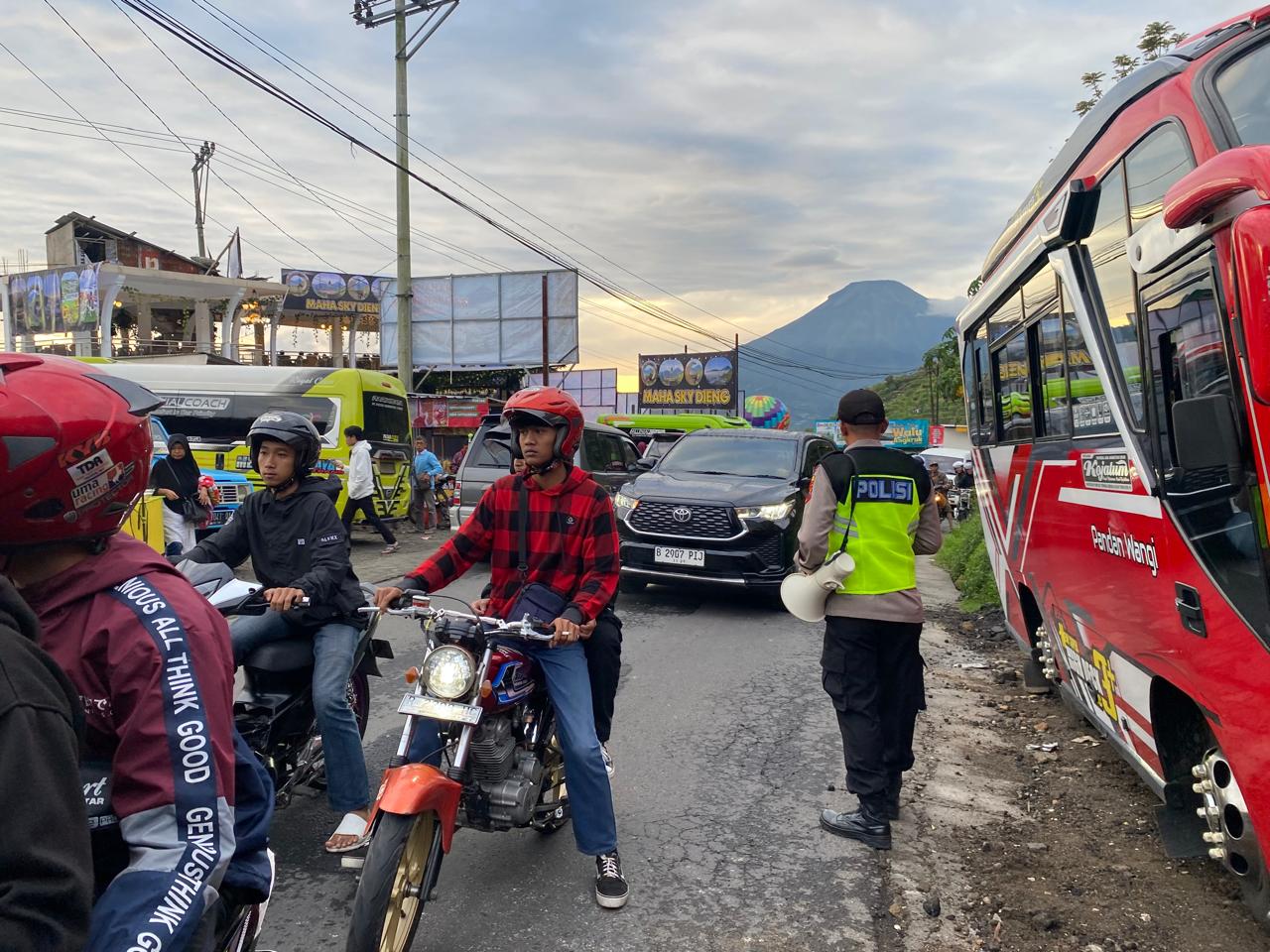 Menjelang siang, kepadatan kendaraan menuju Dieng semakin meningkat. Oleh karena itu, Polres Wonosobo memberlakukan sistem buka-tutup jalan secara situasional untuk mengatur arus kendaraan yang naik ke kawasan wisata.