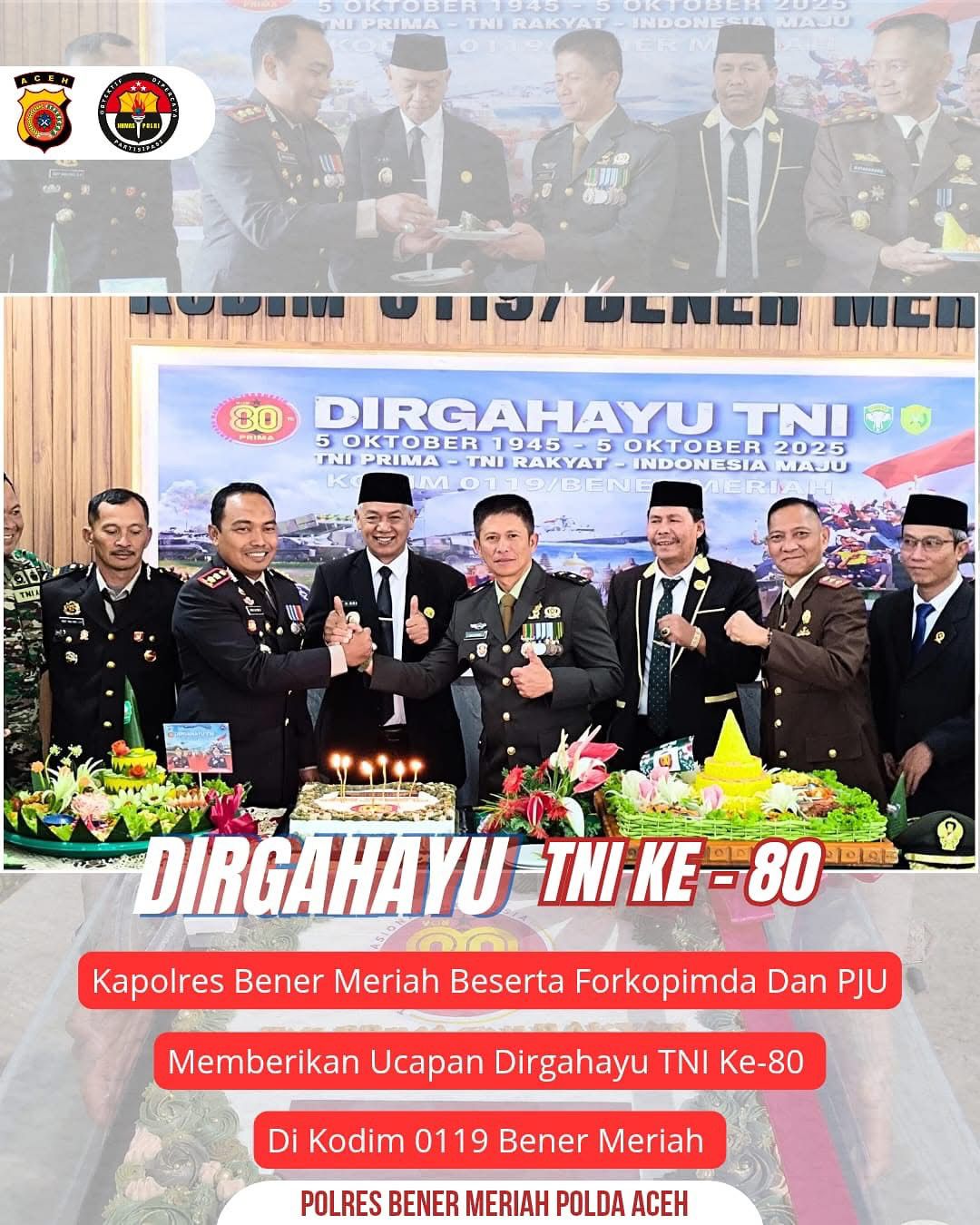 “Alhamdulillah, hari ini kami bersama-sama merayakan HUT TNI ke-80 sebagai bentuk rasa syukur dan simbol sinergitas antara TNI dan Polri dalam menjaga keamanan dan ketertiban di wilayah Kabupaten Bener Meriah. Semoga TNI semakin jaya dan menjadi garda terdepan dalam menjaga kedaulatan Negara Kesatuan Republik Indonesia,” ujarnya.