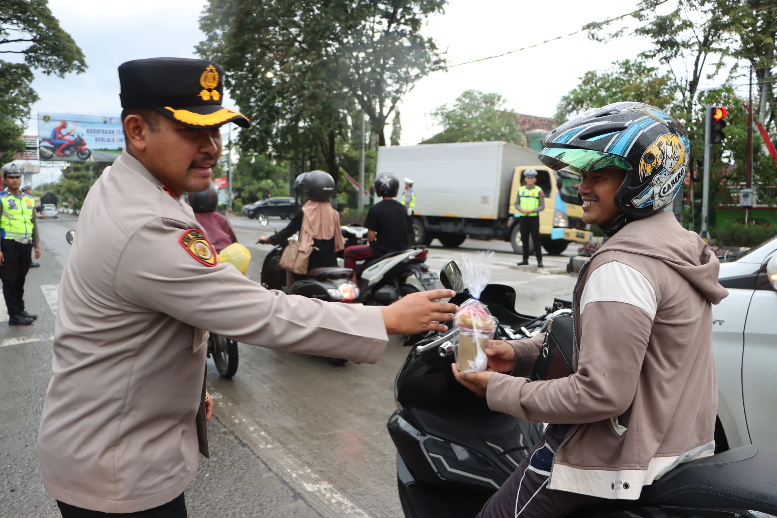 “Takjil ini utamanya kita bagikan pada para pengendara yang tertib berlalu lintas,” kata AKBP Ike Yulianto.