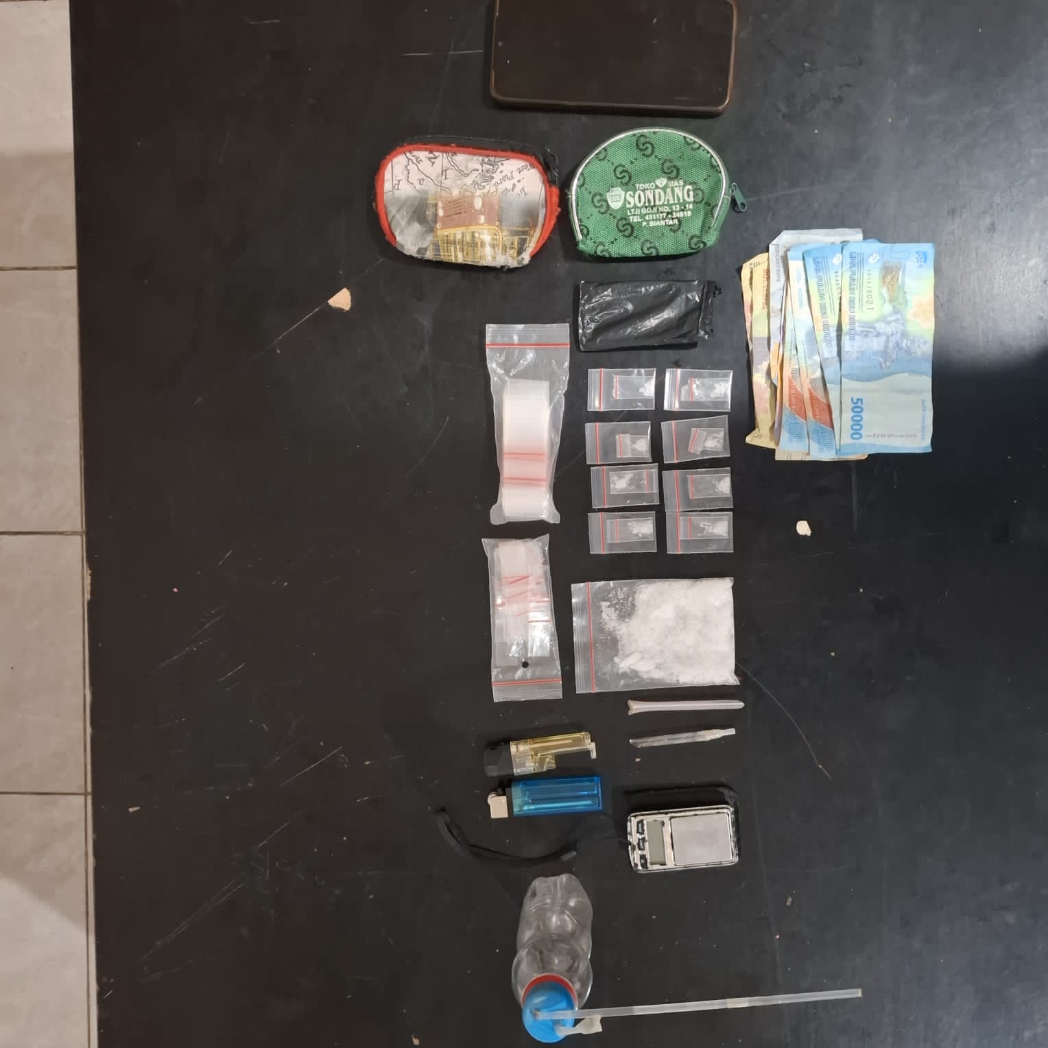 Barang bukti lain yang diamankan dari tersangka Bondro antara lain satu buah timbangan elektronik, satu buah kaca pirex, satu buah sendok plastik pipet, satu buah bong dari botol air mineral, satu unit handphone merek Realme berwarna hitam, dua buah dompet emas, satu buah plastik kresek hitam, dua bal plastik klip kosong, dua buah korek api, dan uang tunai sebesar Rp225.000 yang diduga hasil penjualan narkotika.