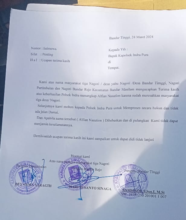 Masih di tempat yang sama, Agus juga mengatakan, “Saya juga pernah menangkap Alfian Nasution mencuri sawit milik masyarakat, dia itu sering ketangkap oleh warga kalau dia melakukan pencurian makanya ada surat perjanjian yang ditandatanganinya. Kalau terkait Pangulu melakukan pemukulan itu semua tidak benar, pada saat itu masyarakat rame dari dua Nagori kumpul di rumah Pangulu Bandar Tinggi karena masyarakat memang sangat resah atas maraknya pencurian sawit dan ubi.”ungkapnya