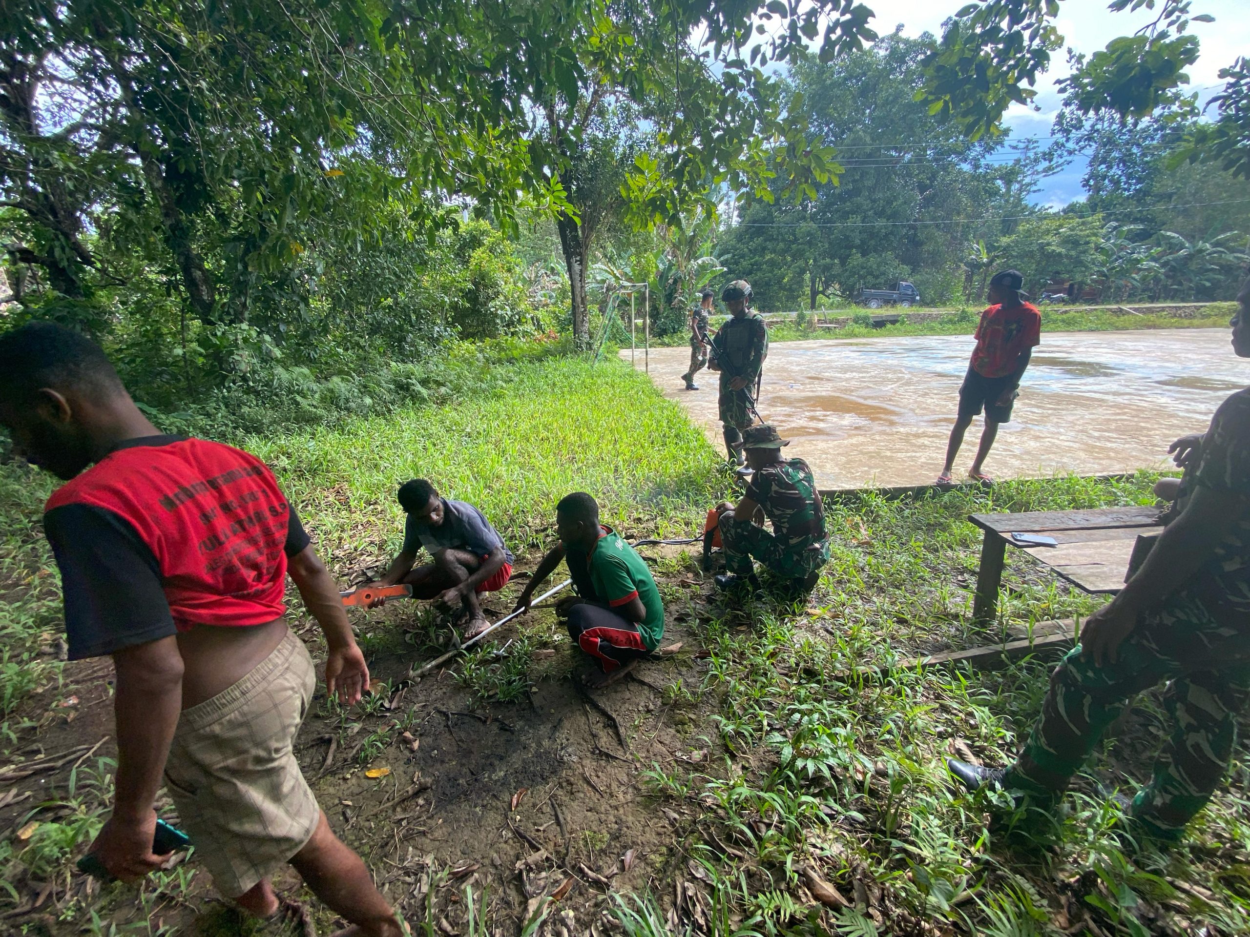 Peduli Lingkungan, Satgas Yonif 762/VYS dan Warga Kampung Persiapan Rober Bersihkan Lapangan Futsal