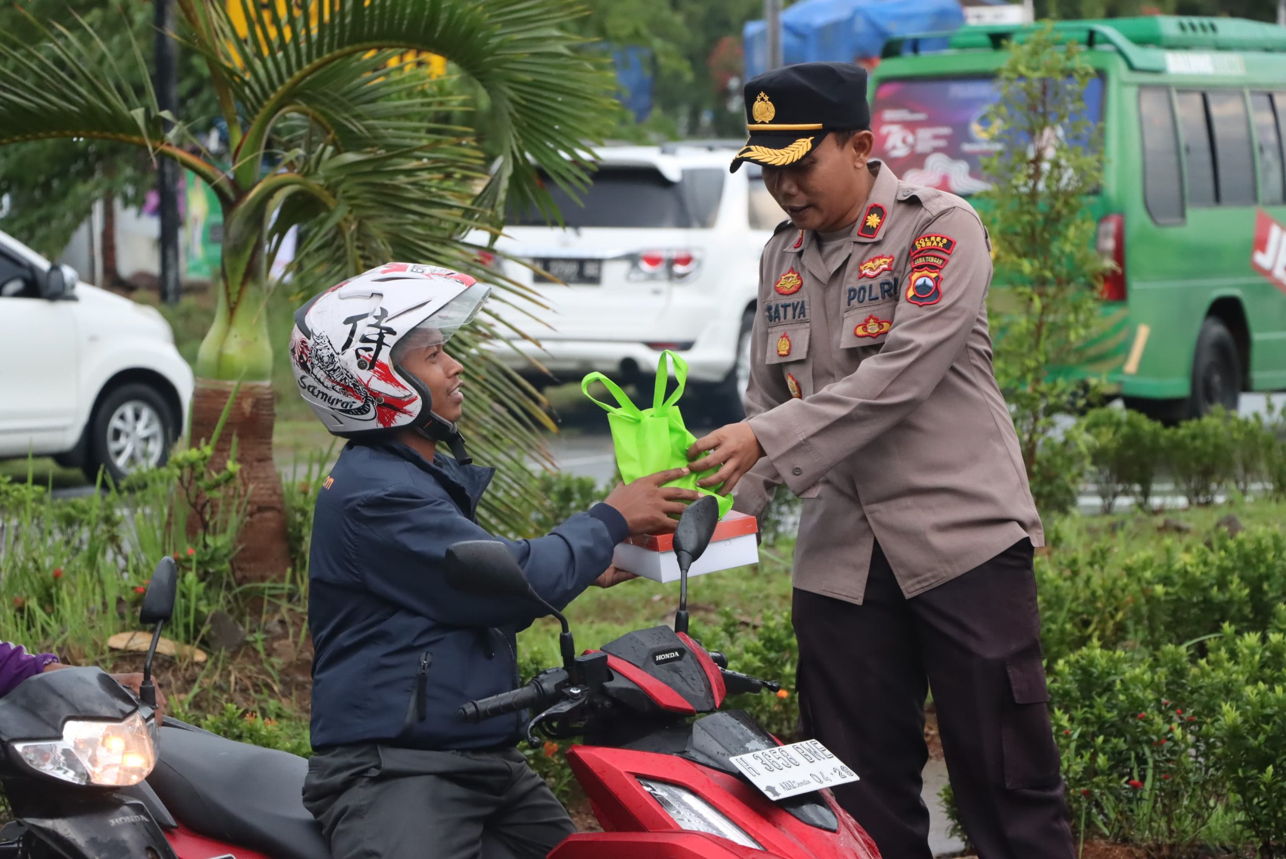 Demak,SaberPungli.net:Polres Demak berbagi takjil kepada masyarakat yang melintas di lampu merah Jalan Sultan Trenggono, depan SMPN 1 Demak, Jumat (7/3/2025).