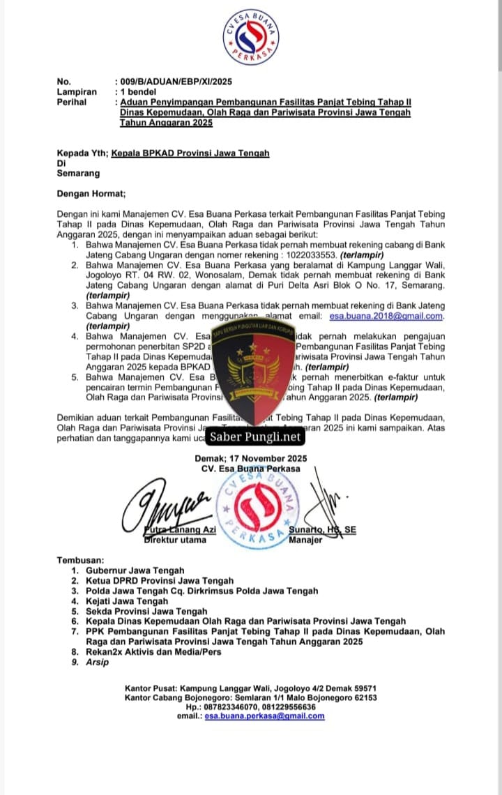 Redaksi akan terus mengembangkan informasi dan meminta konfirmasi resmi dari pihak CV Esa Buana Perkasa, Disporapar Jateng, serta instansi terkait lainnya.
