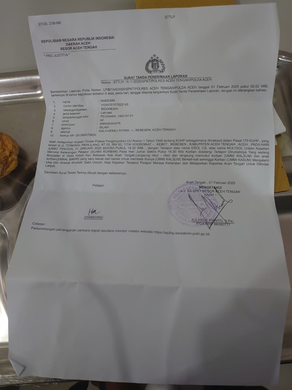 Pada 31 Januari 2025, oknum TNI tersebut dan kepala desa setempat serta anak kepala desa ikut memukul korban dan anak korban beberapa orang lainnya datang ke warung nasi korban dan melakukan kekerasan terhadap korban dan anaknya termasuk anaknya yang masih di bawah umur. Dan setelah itu korban melaporkan kejadian tersebut kepada Polres Aceh Tengah.