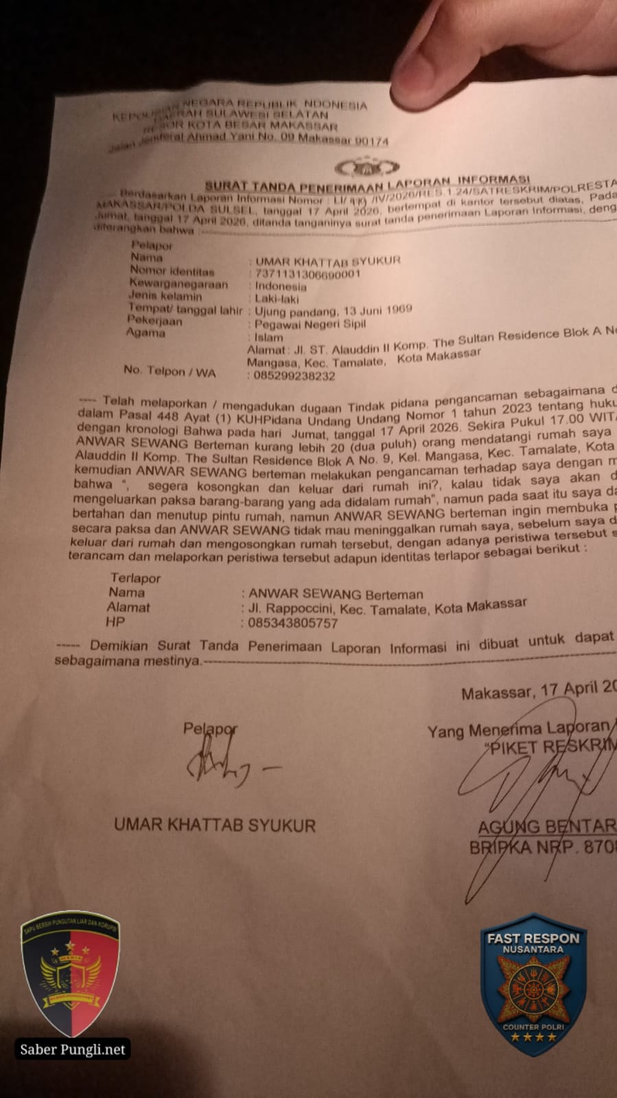 “Laporan awal sempat tidak diterima di Polsek, namun kini sudah diterima di Polrestabes Makassar dan kami berharap segera ditindaklanjuti sesuai hukum yang berlaku,” jelas kuasa hukum.
