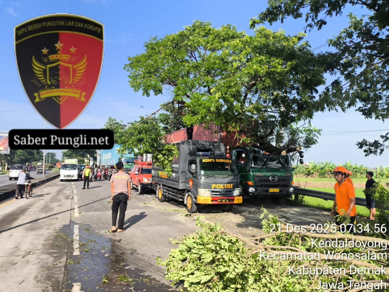 Demak [SaberPungli.net] Kepolisian Resor (Polres) Demak, Jawa Tengah, bersama Badan Penanggulangan Bencana Daerah (BPBD) Kabupaten Demak melakukan evakuasi pohon tumbang di exit Tol Kadilangu, Minggu (21/12/2025) pagi.
