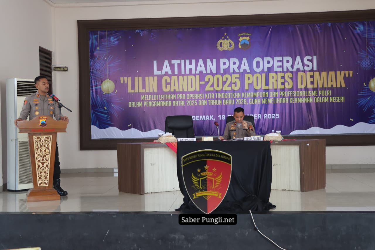Demak [SaberPungli.net] Polres Demak menggelar Latihan Pra Operasi (Latpra Ops) Lilin Candi 2025 di Pendopo Parama Satwika, Kamis (18/12/2025), sebagai kesiapan pengamanan perayaan Natal 2025 dan Tahun Baru 2026 di Kabupaten Demak.