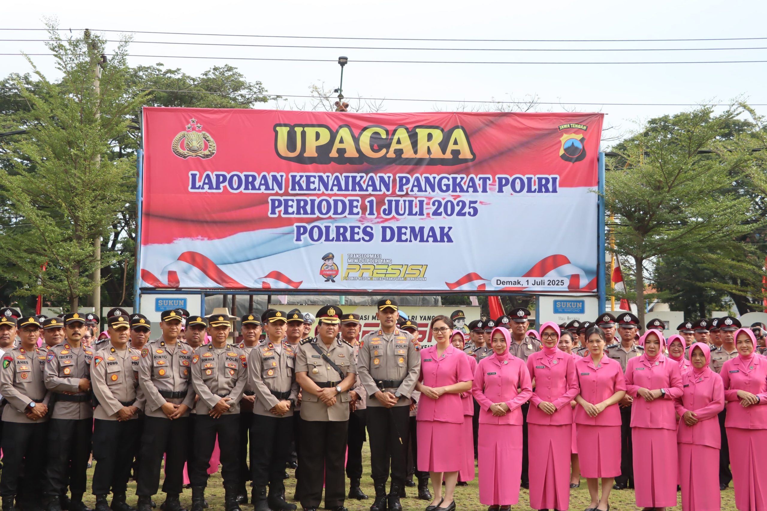 Demak – Kepolisian Resor (Polres) Demak, Jawa Tengah menggelar Upacara Penyerahan Jabatan Kepala Bagian Logistik (Kabag Log) dan Upacara Kenaikan Pangkat (UKP) bagi anggota Polres Demak periode 1 Juli 2025 di Lapangan Wicaksana Laghawa, Senin (30/6/2025) Mapolres setempat.