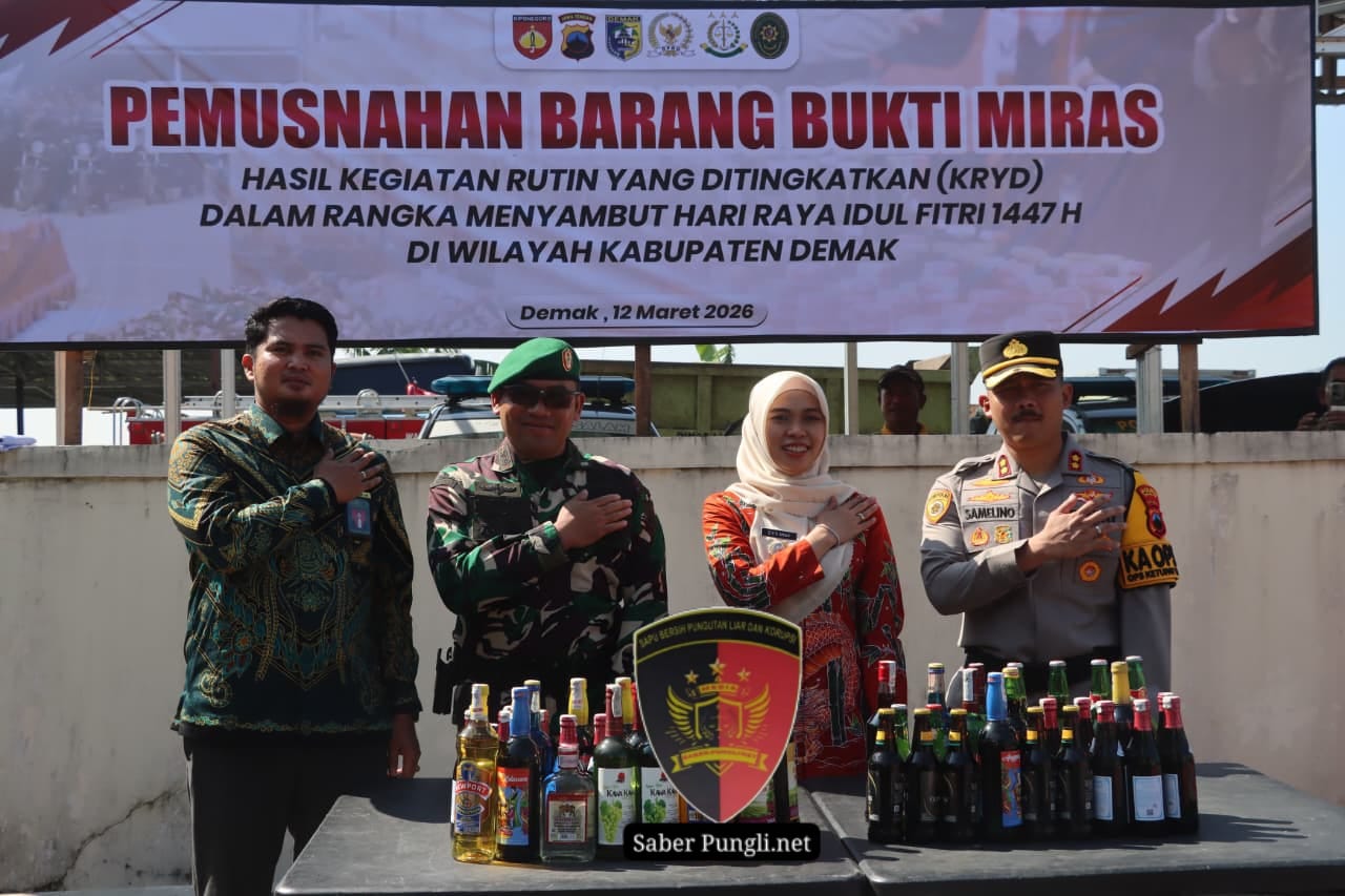 Demak [SaberPungli.net] Polres Demak memusnahkan ribuan botol minuman keras (miras) hasil Operasi Pekat Candi 2026 dan Kegiatan Rutin Yang Ditingkatkan (KRYD) di Pendopo Parama Satwika Mapolres Demak, Kamis (12/3/2026).