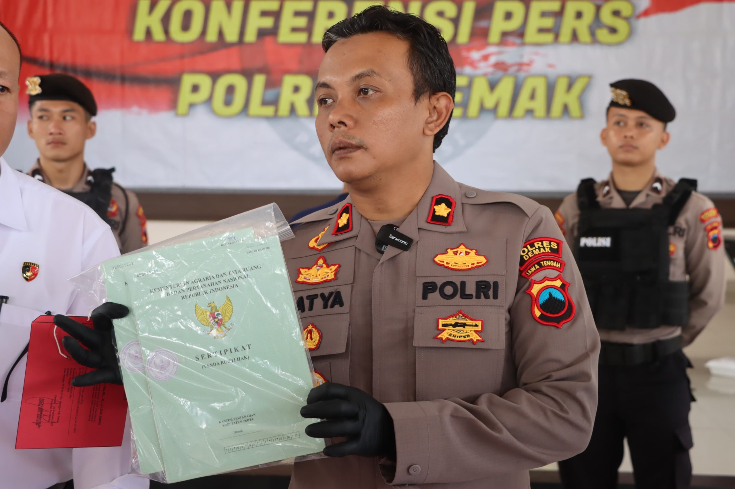 “Dalam proses balik nama sertifikat tanah, korban dimintai uang sebesar Rp. 9 juta. Namun tersangka tidak mau menyerahkan sertifikan tanah secara langsung kepada korban,” kata Wakapolres Demak Kompol Satya Adi Nugroho saat gelar perkara di Mapolres setempat, Rabu (16/4/2025).