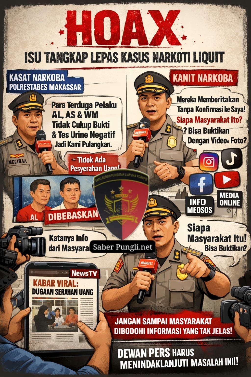 Makassar [SaberPungli.net] Beredarnya informasi di sejumlah media online dan media sosial terkait dugaan “tangkap-lepas” kasus narkotika jenis sintetis (liquid) yang menyeret tiga orang terduga pelaku berinisial AL, AS, dan WM, dipastikan tidak benar alias hoaks.