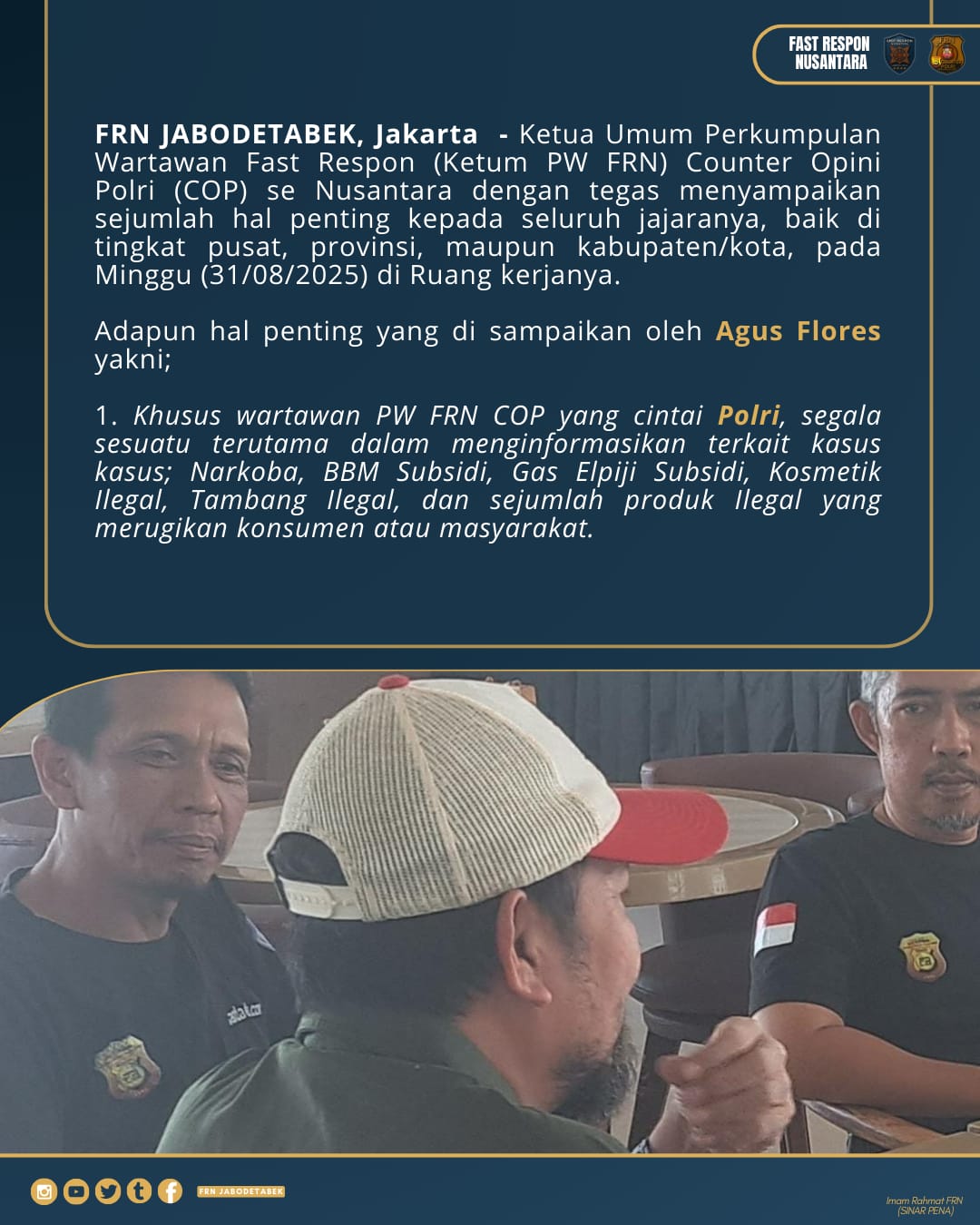 Ketua Umum PW-FRN Counter Polri, Agus Flores, menyampaikan sejumlah arahan penting kepada seluruh jajaran pengurus dan anggota FRN di Sulawesi Selatan. Dalam penyampaiannya, Agus menegaskan bahwa PW-FRN berkomitmen mendukung kinerja Polri sekaligus menjalankan fungsi sosial kontrol melalui pemberitaan.