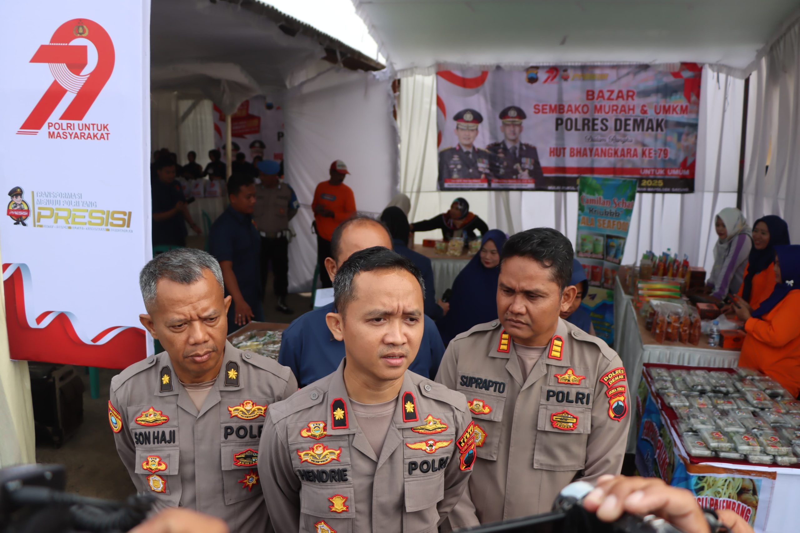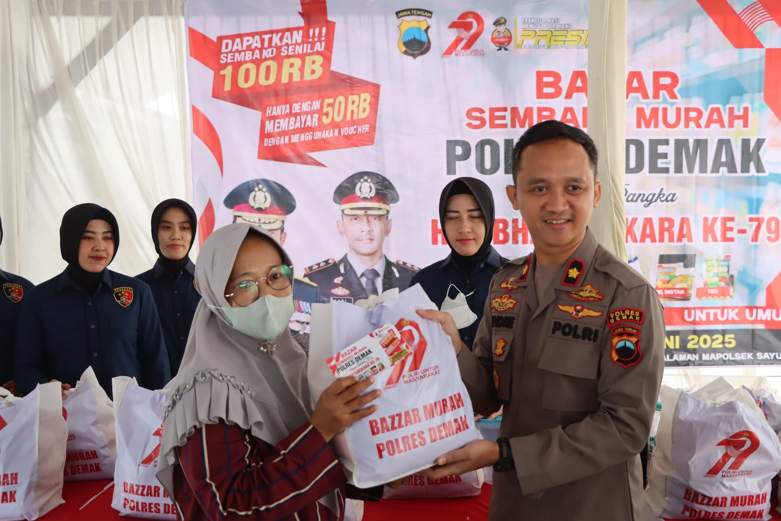 Demak,SaberPungli.net: Kepolisian Resor (Polres) Demak, Jawa Tengah menggelar kegiatan pasar murah sembako dan bazar Usaha Mikro Kecil Menengah (UMKM) di Polsek Sayung, Rabu (25/6/2025). Acara itu bagian dari rangkaian peringatan Hari Bhayangkara ke-79.