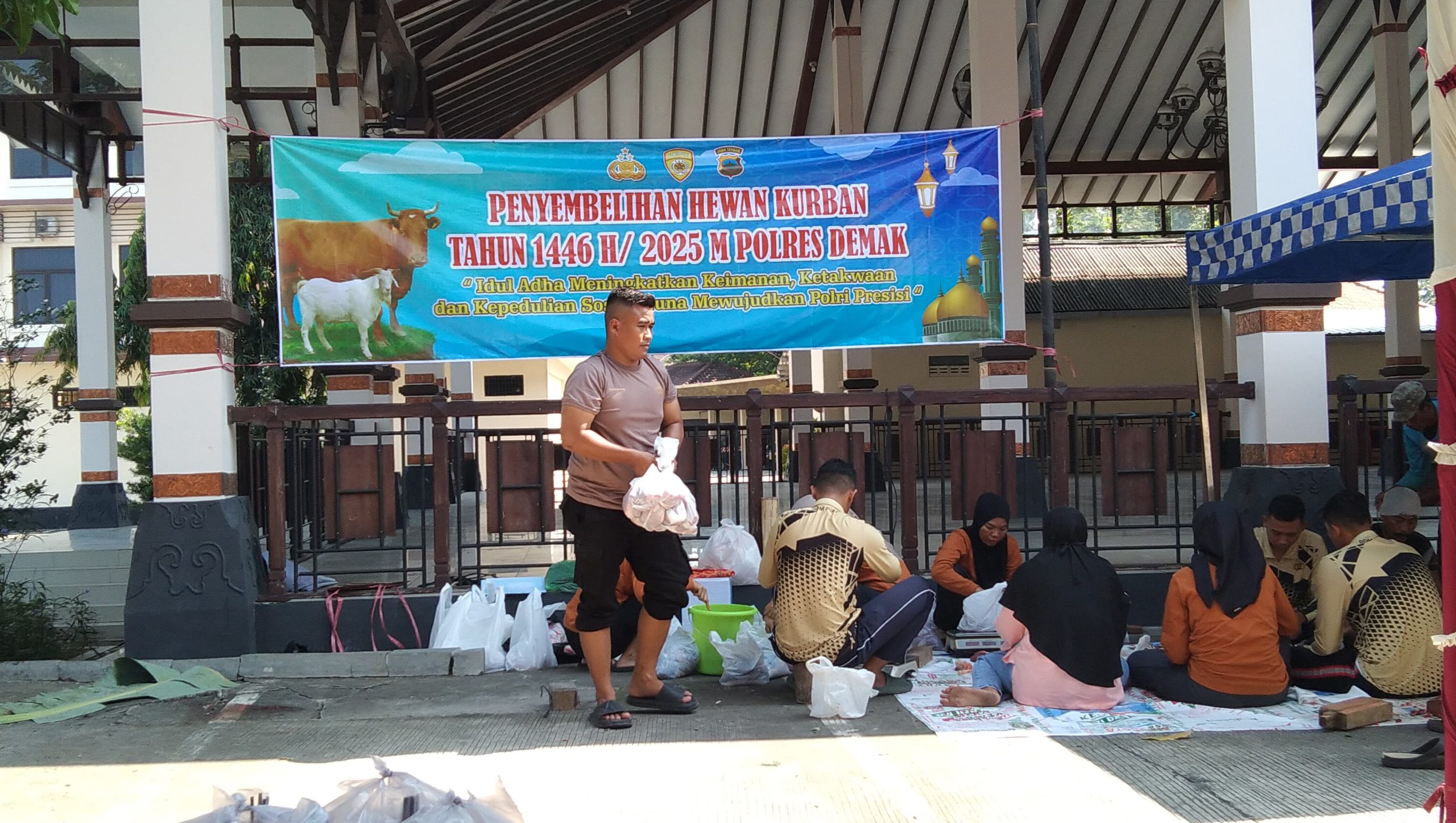 Demak – Dalam rangka menyambut Hari Raya Idul Adha 1446 H, Polres Demak melaksanakan penyembelihan hewan kurban di halaman Mapolres Demak pada Jum’at (6/6/2025). Sebanyak enam ekor sapi dan lima ekor kambing disembelih sebagai bentuk ibadah serta kepedulian sosial kepada masyarakat sekitar.