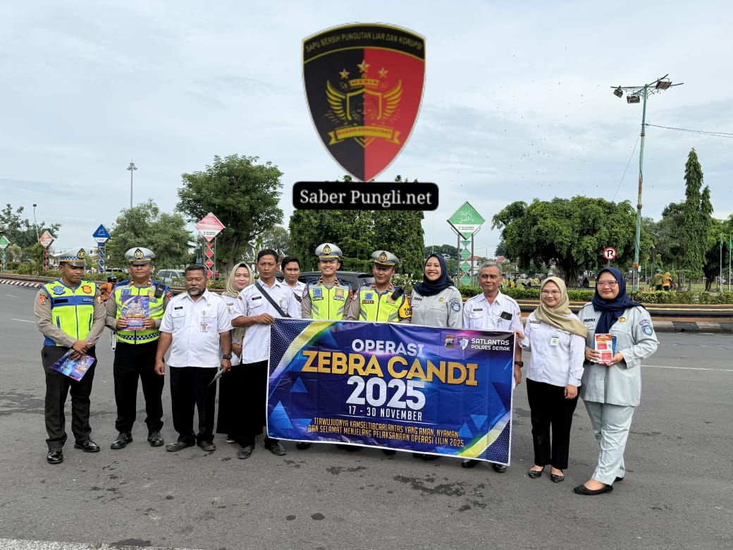 Demak [SaberPungli.net] Satuan Lalu Lintas Polres Demak menggelar sosialisasi Operasi Zebra Candi 2025 di Alun-alun Demak, Rabu (19/11/2025). Kegiatan yang dipimpin Kepala Urusan Pembinaan dan Operasional (KBO) Satlantas Polres Demak, Iptu Djoko Prayitno itu menyasar para pengguna jalan yang melintas di kawasan pusat kota. Sosialisasi dilakukan untuk meningkatkan kepatuhan masyarakat terhadap aturan lalu lintas selama pelaksanaan Operasi Zebra yang berlangsung 17–30 November 2025.