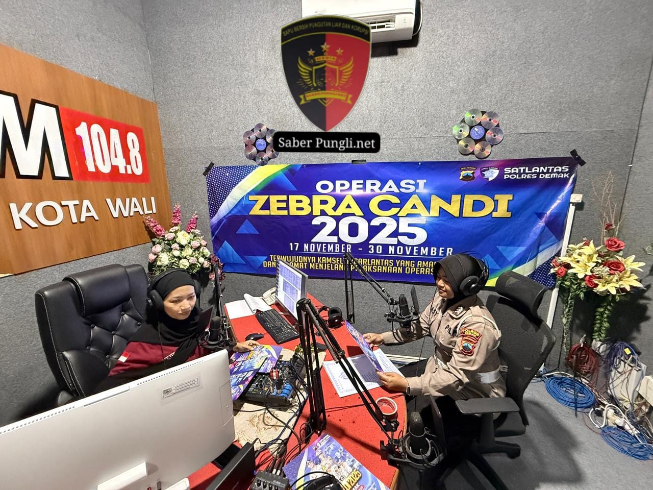 Demak [SaberPungli.net] Satuan Lalu Lintas Polres Demak melaksanakan sosialisasi Operasi Zebra Candi 2025 melalui program talk show di Radio Suara Kota Wali 104.8 FM, Selasa (18/11) kemarin. Sosialisasi tersebut dipimpin Kanit Kamsel Satlantas Polres Demak, Iptu Rohmat Sukoprihanto, sebagai upaya mengedukasi masyarakat mengenai pentingnya tertib berlalu lintas selama pelaksanaan operasi.