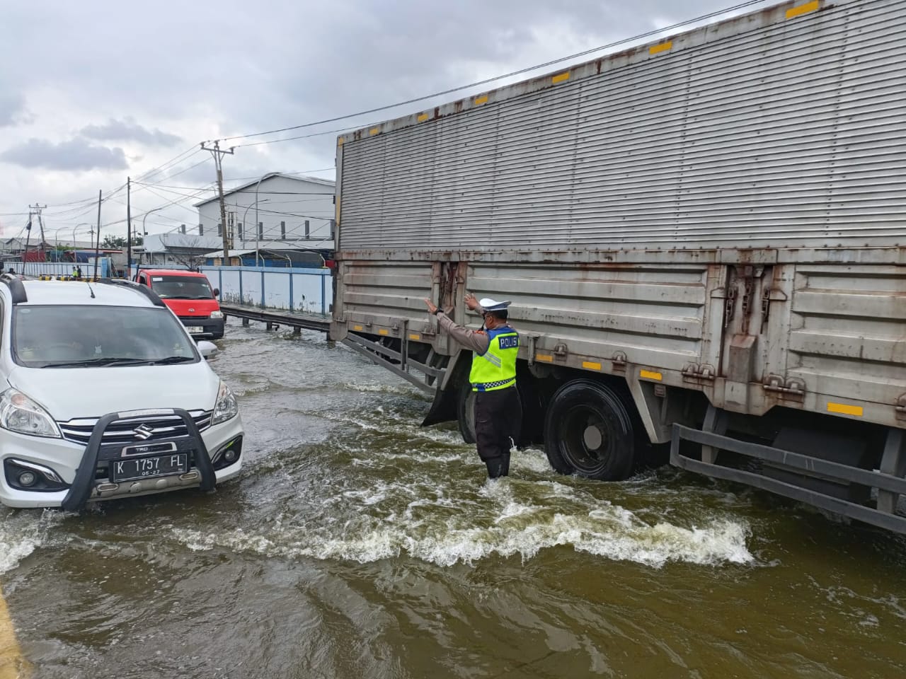 Dalam hal tergenangnya air di jalan, Kasat Lantas AKP Thoriq Aziz,STK,SIK,SH,MH memerintahkan personil langsung melakukan pengaturan lalu lintas di lokasi luapan air Rob tersebut guna menghindari kemacetan dan kecelakaan.