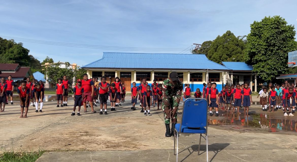 Sehat dan Disiplin, Satgas Yonif 762/VYS Olahraga Bersama dan Melatihkan PBB murid SD Inpres 13 Kumurkek