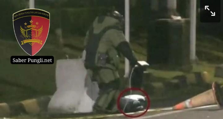 Selepas itu, anggota penjinak bom berpakaian lengkap bak astronot mendekati tas gendong tersebut.