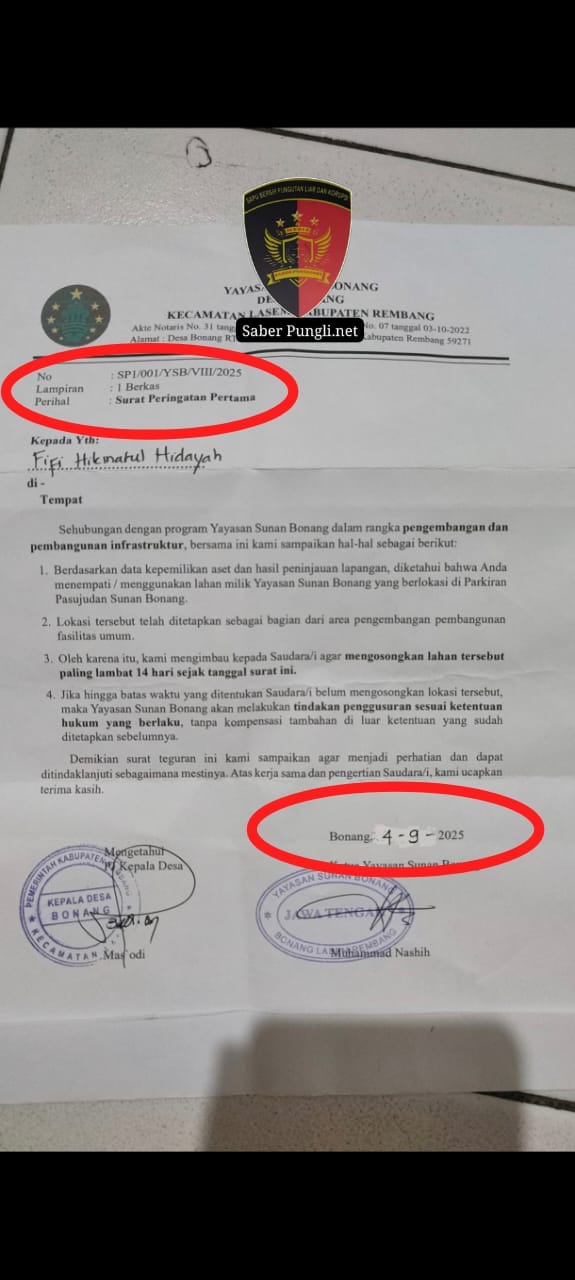 Saat tim mengkonfirmasi tentang kebenaran surat perintah 1 ( SP 1 ) ke Ketua Umum yayasan dan kepala desa Mas odi selaku PJ kepala desa sekaligus sebagai ketua harian yayasan Pasujudan sunan Bonang menyampaikan dan membenarkan surat perintah 1 ( Sp 1 ) tersebut Dia yang menandatangani , namun surat yang di tanda tanganinya ngak pernah ada coretan tipx, sesuai yang ada di dalam surat tersebut dan merasa kaget saat mengetahui surat itu ada coretan tipx ” tutur nya.