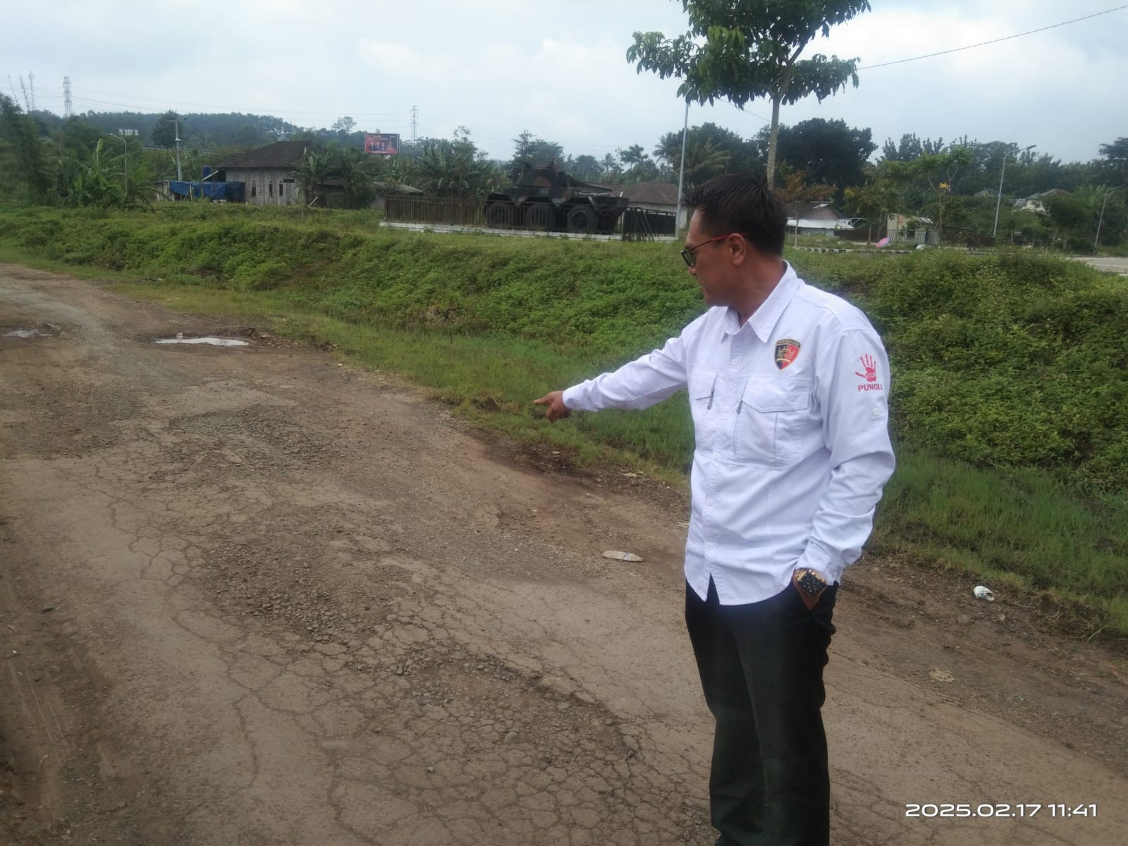 Pimpinan Umum SaberPungli.net[Edwin DEi] menunjukan kerusakan jalan depan wisata TWSS ,jalan akses warga  untuk proyek tol Salatiga di tahun 2025