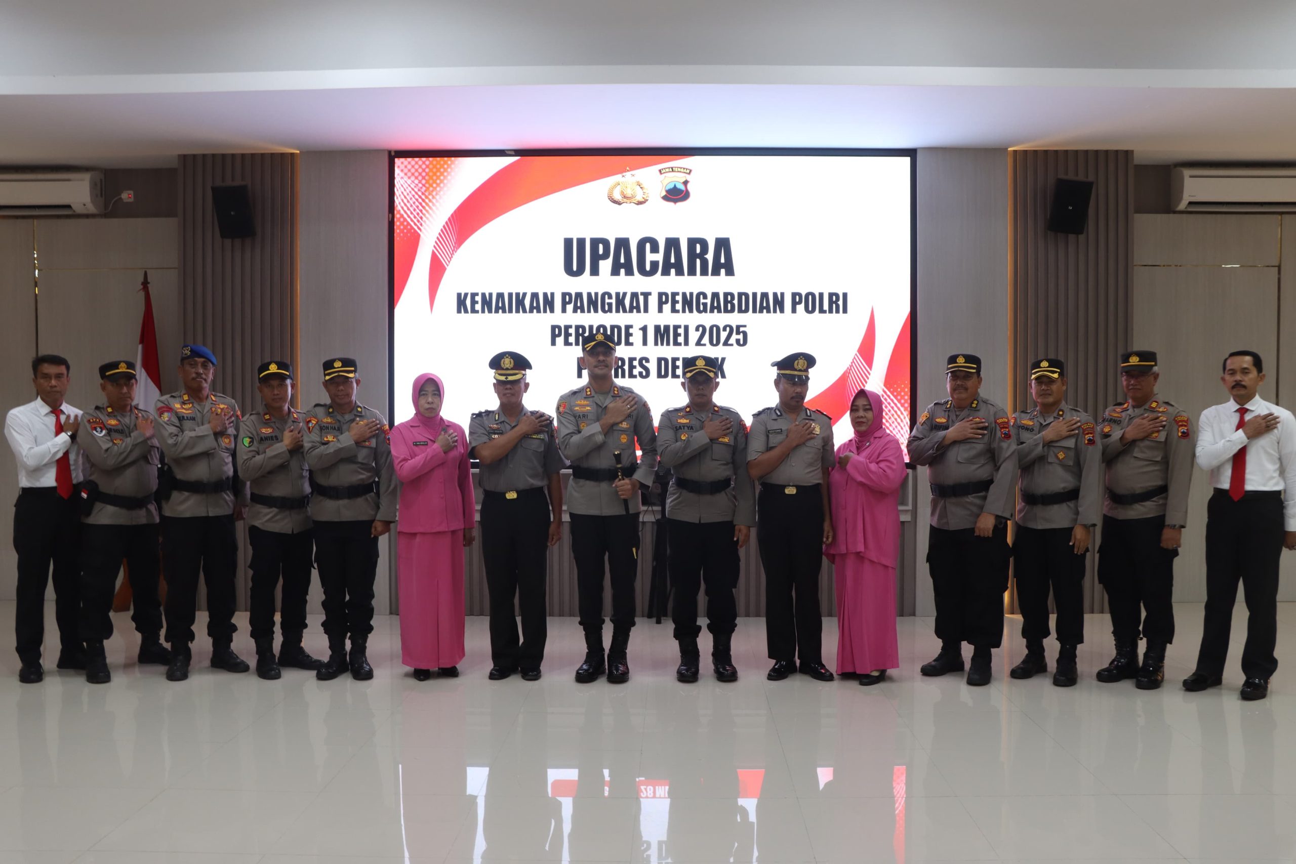 Dalam upacara tersebut, dua personel mendapatkan kenaikan pangkat pengabdian dari Ajun Komisaris Polisi (AKP) menjadi Komisaris Polisi (Kompol) serta dari Ajun Inspektur Polisi Satu (AIPTU) menjadi Inspektur Polisi Dua (IPDA). Mereka adalah Kompol Ahmad Abdullah, Kasubbagstrajemen RB Polres Demak dan IPDA Kastomo, anggota Polsek Wedung Polres Demak.